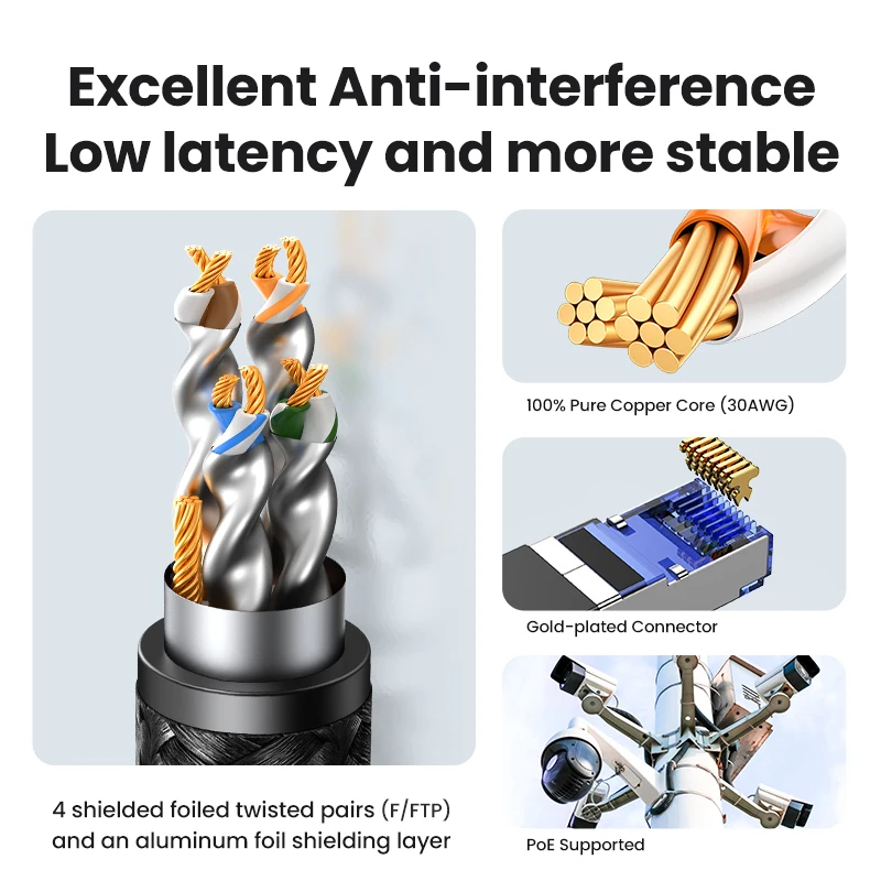 Cables are designed with 4 shielded foiled twisted pairs (F/FTP) and an aluminum foil shielding layer. This design can greatly reduce interference and crosstalk from adjacent pairs and other cables, making network speed faster and more stable.